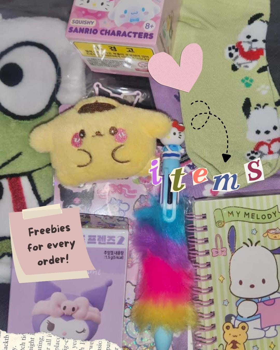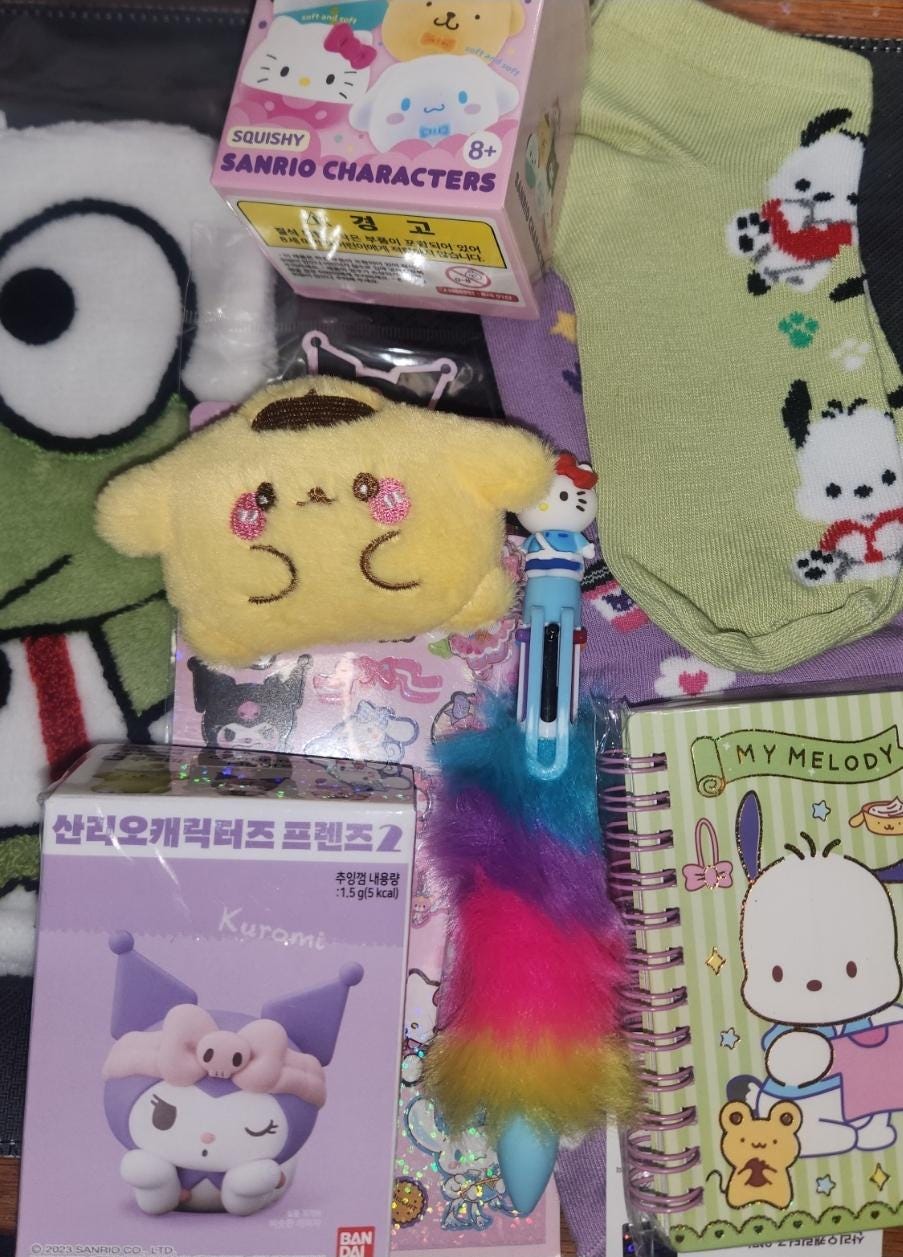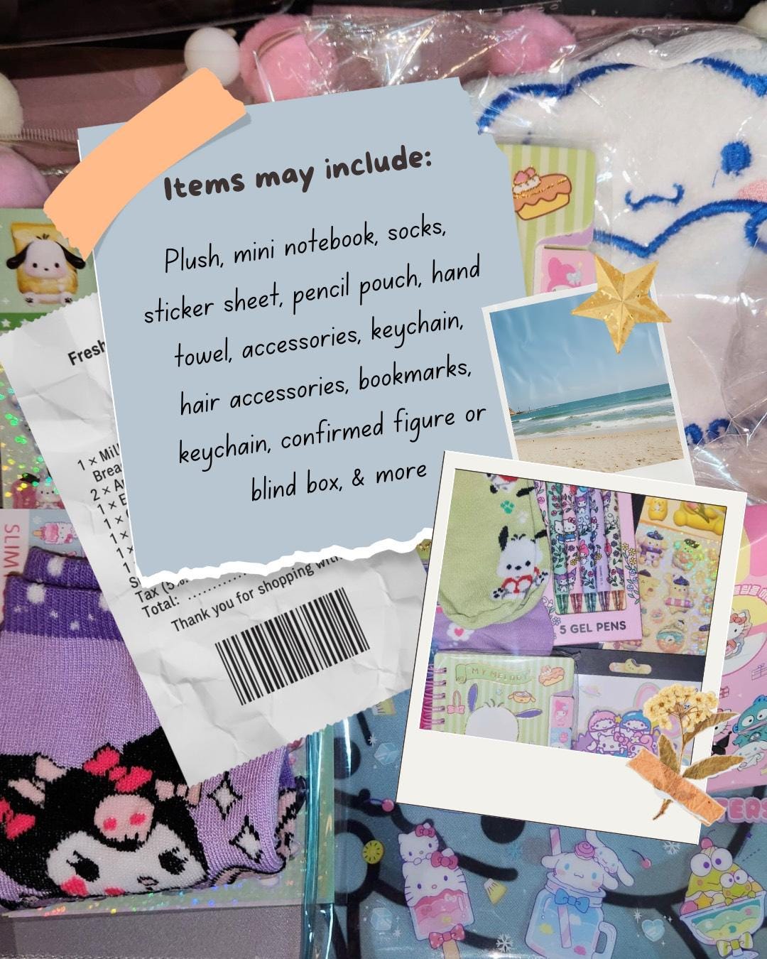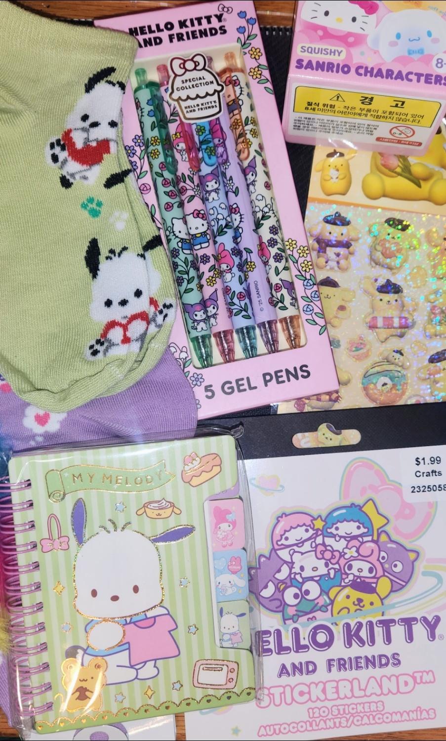 You get a mixture of at 7-10 items that may include:character socks,character theme sticker sheet, character pencil pouch, character mini notebook, character mini plush, character hand towel, character confirmed or blind box, accessories.