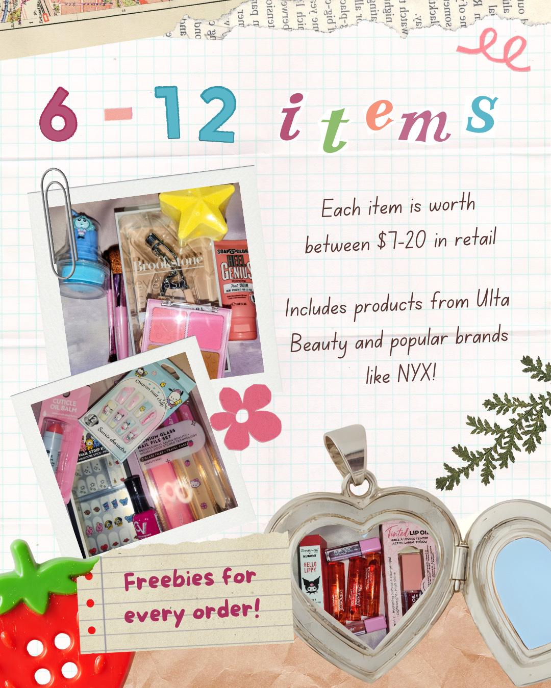 Discover the excitement of a Beauty Charm Scoop! Each scoop includes 6-10 surprise beauty items, such as lip gloss, oil, lipstick, nail polish strips, press on nails, makeup brushes and sponges, eyeshadow and face pallets, self care items, hair accessories, highlighters, contours and more.