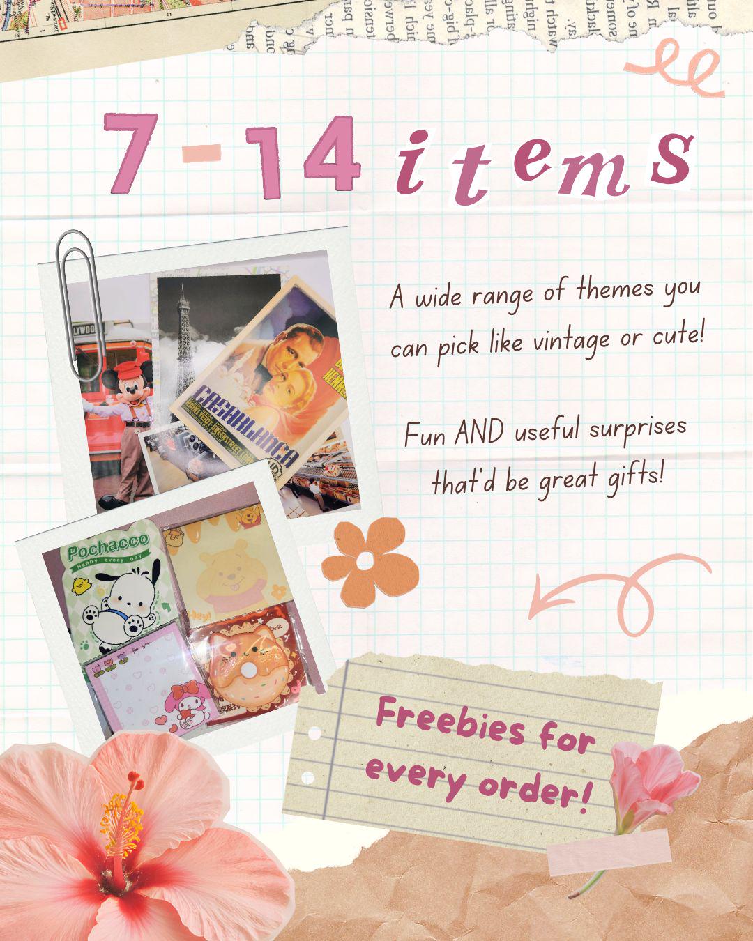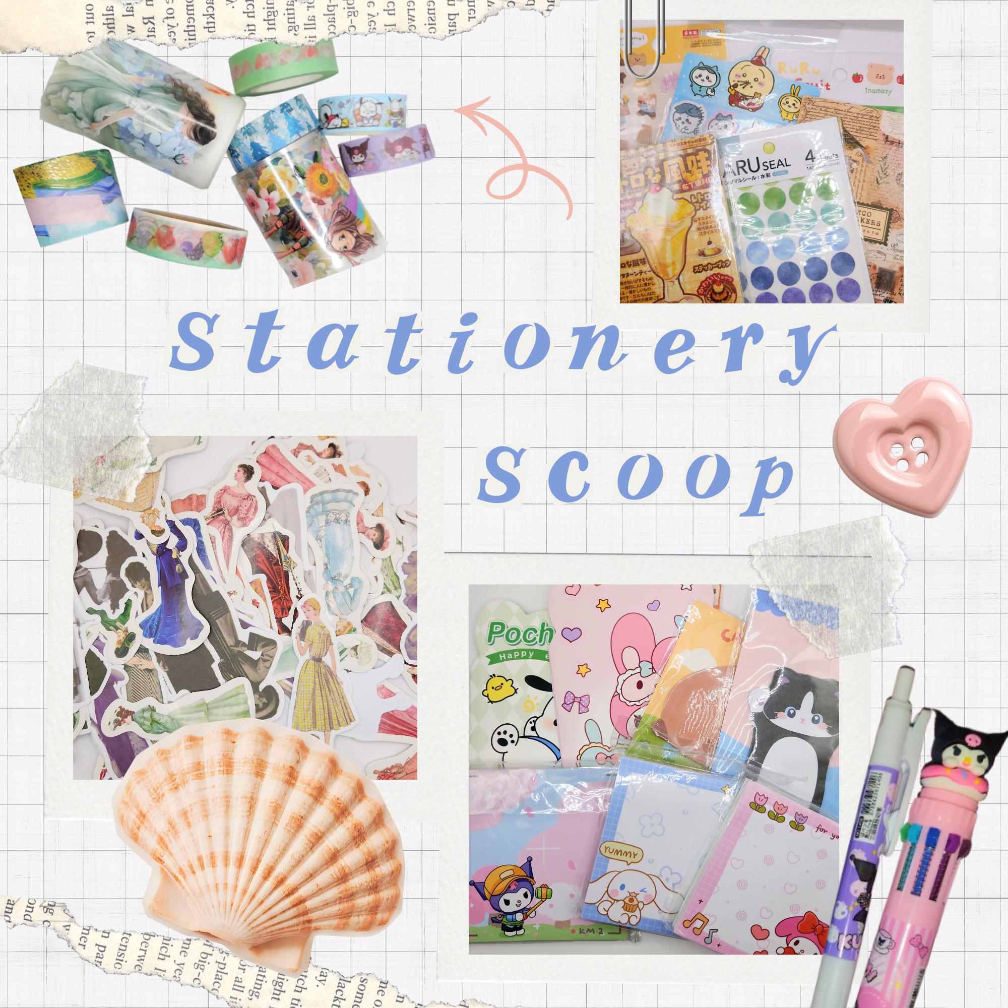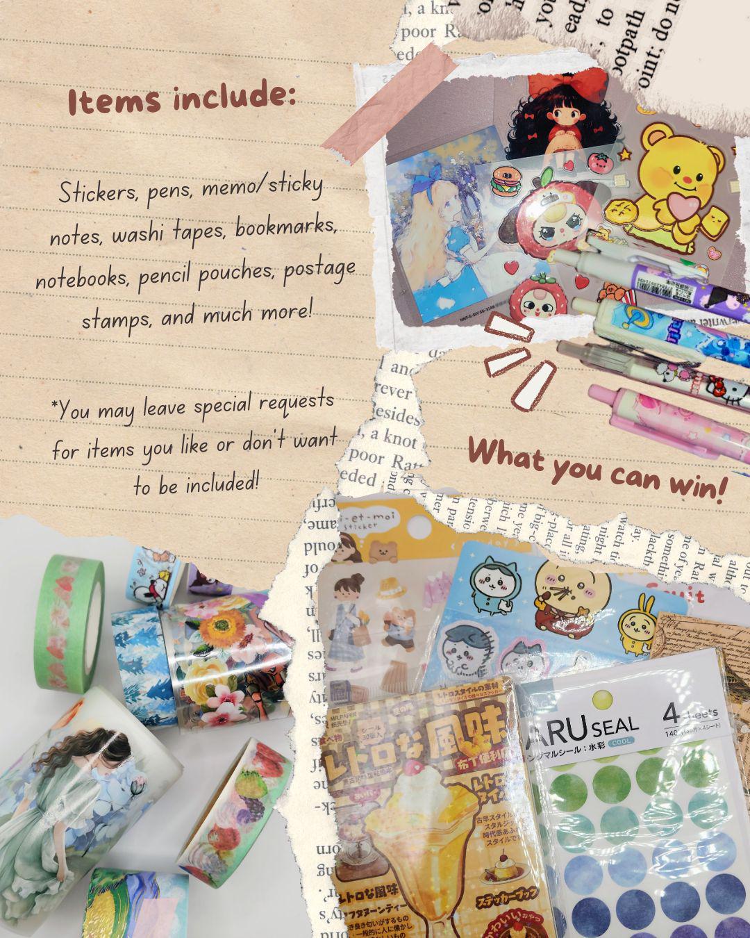 Will contain items like: waterproof PET sticker sheet, washi tape roll, pen, bookmark, ephemera, stickers, stationary tools, pencil pouch or mini notebook. Chance to win a free mystery gift with each scoop!